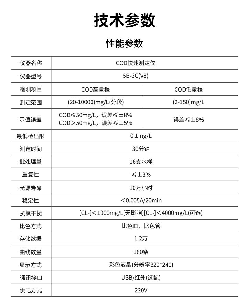 1、測定范圍:(20~10000)mg/L(分段)