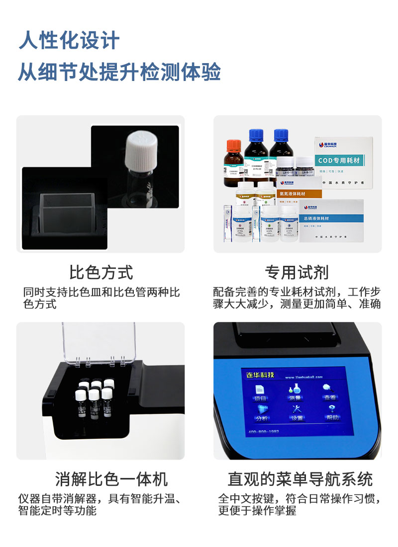 簡要描述: 依據(jù)國家《快速消解分光光度法(HJ/T399-2007)》原理設計制造,符合JJG975-2002化學需氧量(COD)測定儀檢定規(guī)程,經(jīng)典的消解比色一體型,具有多光路無干涉系統(tǒng),可測定COD、氨氮、總磷和濁度。支持皿比色和管比色兩種比色方式。