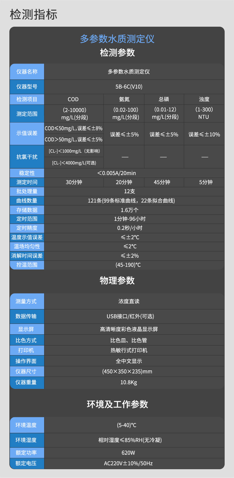 5B-6C(V10)多參數(shù)水質(zhì)測定儀在穩(wěn)定性、準確性、測定范圍、多功能、實用簡便性等多方面實現(xiàn)了質(zhì)的提升,具有很高的性價比,可測定COD、氨氮、總磷、濁度四個指標。